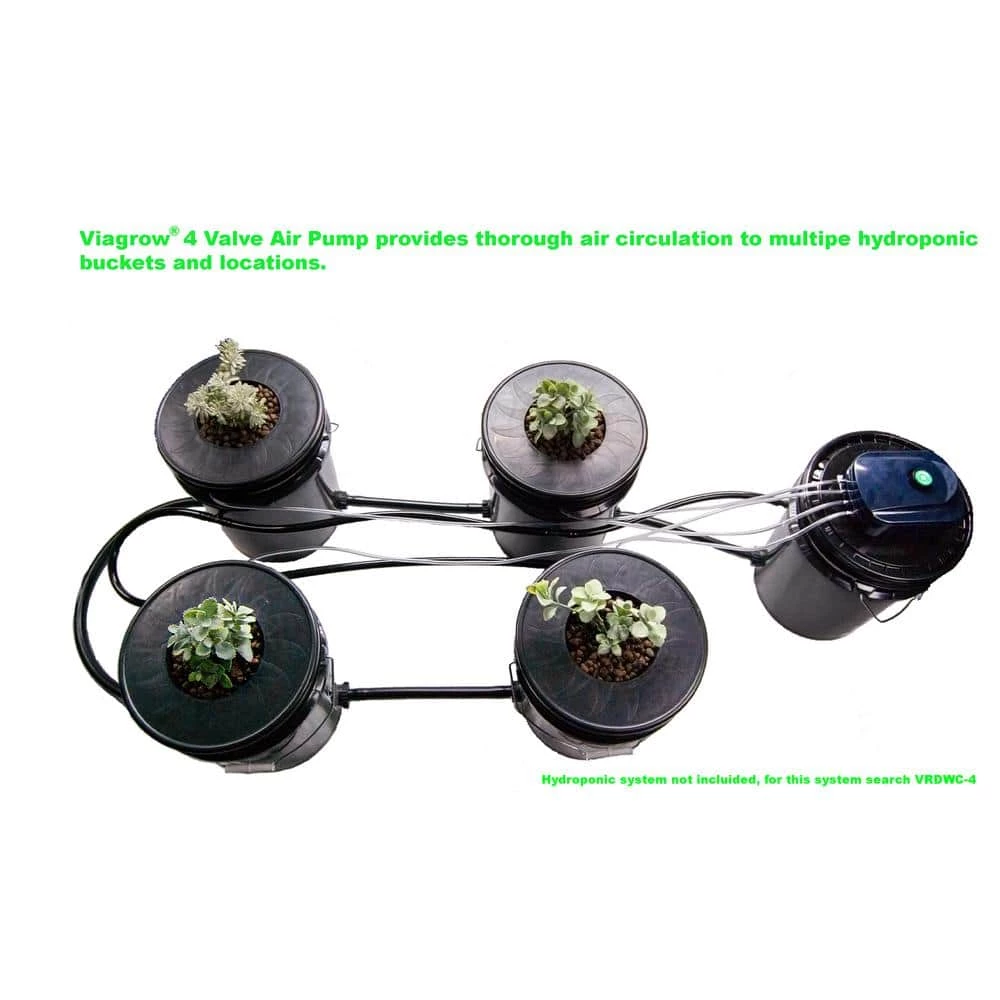 The Viagrow Four Valve Air Pump is the perfect choice for your air accessory needs. The unique, stylish design keeps the noise down to a minimum. Our Air Pump features easy maintenance and maintains optimum airflow. Specs are 10 L/min (2.5 L/min per valve), 8W and four post and utilizes 1/4 in. OD 3/16 in. ID tubing. Kit includes 24 ft. 3/16 in. clear tubing, 4 round 2 in. air stone, 4 – 4 mm check valves and the four valve air pump.